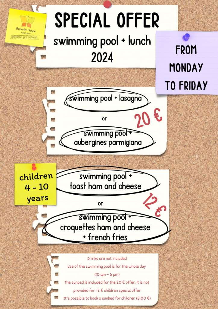 Piscina + lasagna oppure Piscina + parmigiana di melanzane 20 € — Piscina + toast prosciutto e formaggio oppure Piscina + crocchette prosciutto e formaggio + patatine 12 € Le bibite sono escluse. L’utilizzo della piscina è per l’intera giornata (10 – 18). Il lettino è incluso nel pacchetto da 20 €, non è previsto […]